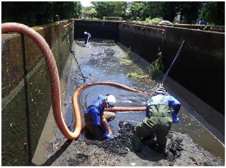 各種ピット等においては清掃が不十分であると有毒ガスの発生や放流水の水質低下に繋がり、下流域に悪影響を及ぼしかねないことから、計画的な清掃が必要となります。清掃に伴い回収した処理物は関係法令を遵守し適正に処分します。