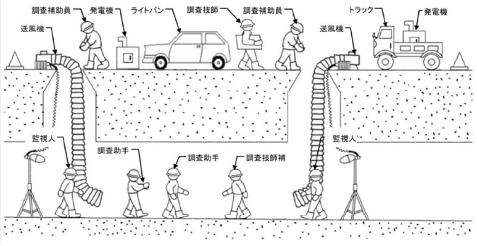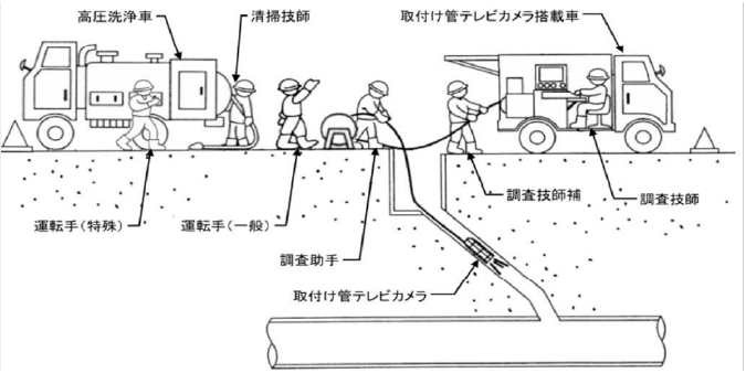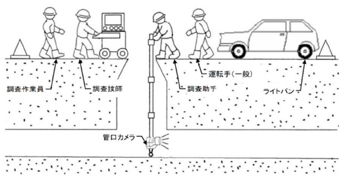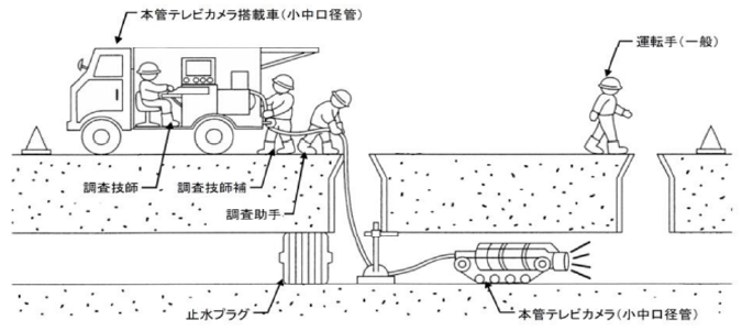 下水道管路施設や暗渠、各種排水管の維持管理を適正に行うためには、管渠内の異状の有無など調査を行い、状況を把握する必要があります。管径φ50㎜からφ150㎜未満は押込み式TVカメラによる調査、管径φ150㎜からφ1,000㎜未満は自走式TVカメラによる調査(最大φ2,000㎜まで可能)、管径φ1,000㎜以上は調査員が管渠内に入り目視による調査を行います。また、公共下水道など管径φ150㎜からφ800㎜程度の管渠では調査員がマンホールに入らず地上部からマンホール内に管口カメラを挿入し、上・下流の管渠内を管口から点検する方法などもあります。調査目的や対象管径、調査延長、有毒ガス発生の有無など総合的に勘案して調査方法を決定します。