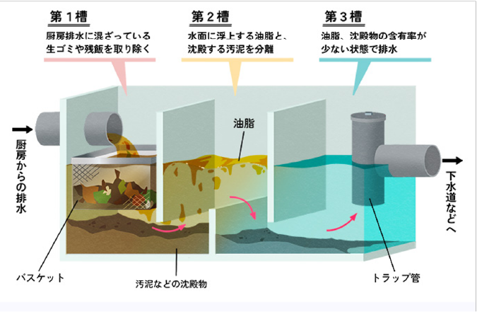 飲食店やレストラン、ホテル、病院などの厨房から排水には多量の油脂や残さが含まれています。グリーストラップの管理を怠ると排水管の詰まりや悪臭・害虫が発生するほか、公共下水道施設や浄化槽に負担を与え処理能力を低下させるため、適正な維持管理の必要があります。