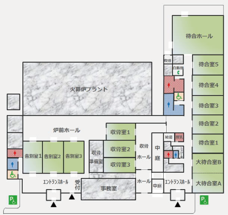 待合ホール(48人収容)、待合個室:和1室、洋4室(それぞれ32人収容)、大待合室(72人収容) など